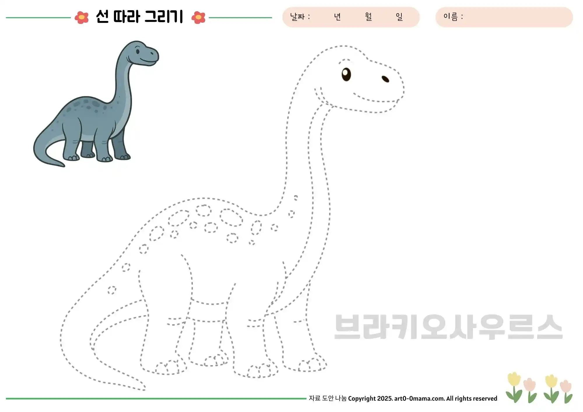 공룡 좋아하는 아이들에게 최고의 활동입니다. 브라키오사우르스는 아이들이 특히 좋아하는 공룡 중 하나예요. 긴 목과 커다란 몸집 덕분에 멀리 있는 나뭇잎까지 먹을 수 있었던 초식 공룡이지요. 이번에 준비한 따라그리기와 색칠놀이 도안은 아이들이 공룡에 대한 호기심을 키우면서 동시에 소근육 발달과 집중력 향상에 도움이 되는 학습 자료입니다.