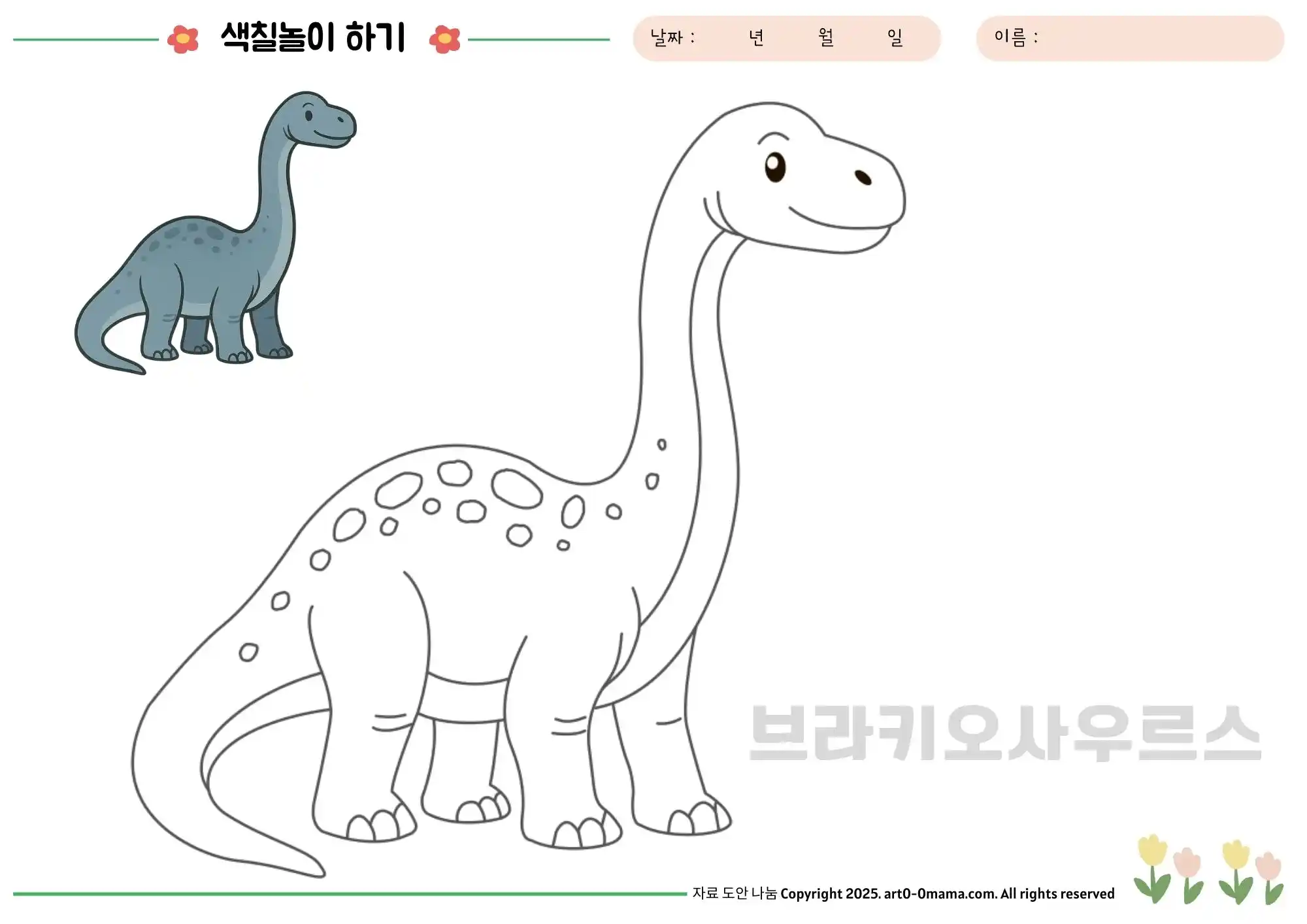 색칠하기 도안에서는 아이들이 자유롭게 색을 입히며 자신만의 브라키오사우르스를 만들 수 있습니다. 실제로 브라키오사우르스의 피부색은 정확히 알 수 없지만, 아이들이 상상력을 발휘해 초록, 파랑, 심지어 분홍색으로 칠해도 좋아요. 색칠을 하며 손가락 근육이 발달하고, 색의 조합을 스스로 선택하며 창의력도 키울 수 있습니다.