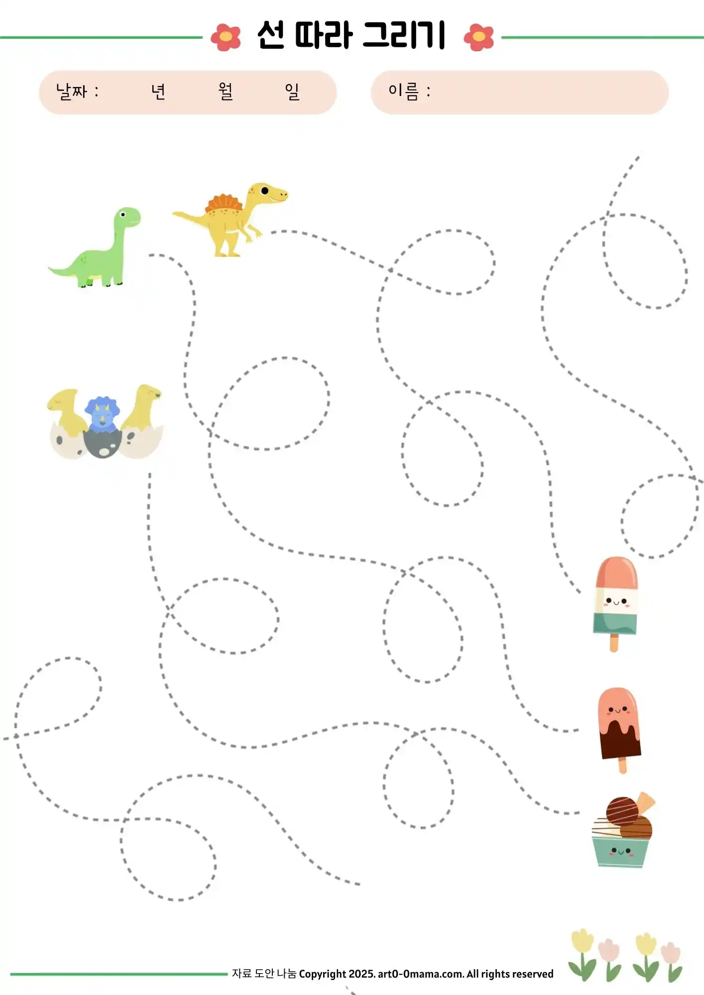 공룡과 귀여운 아이스크림 캐릭터가 등장하는 선 따라 그리기 도안은 아이들의 상상력을 자극합니다. 선을 따라가며 친구들을 이어주면서 자연스럽게 놀이가 학습으로 이어집니다.