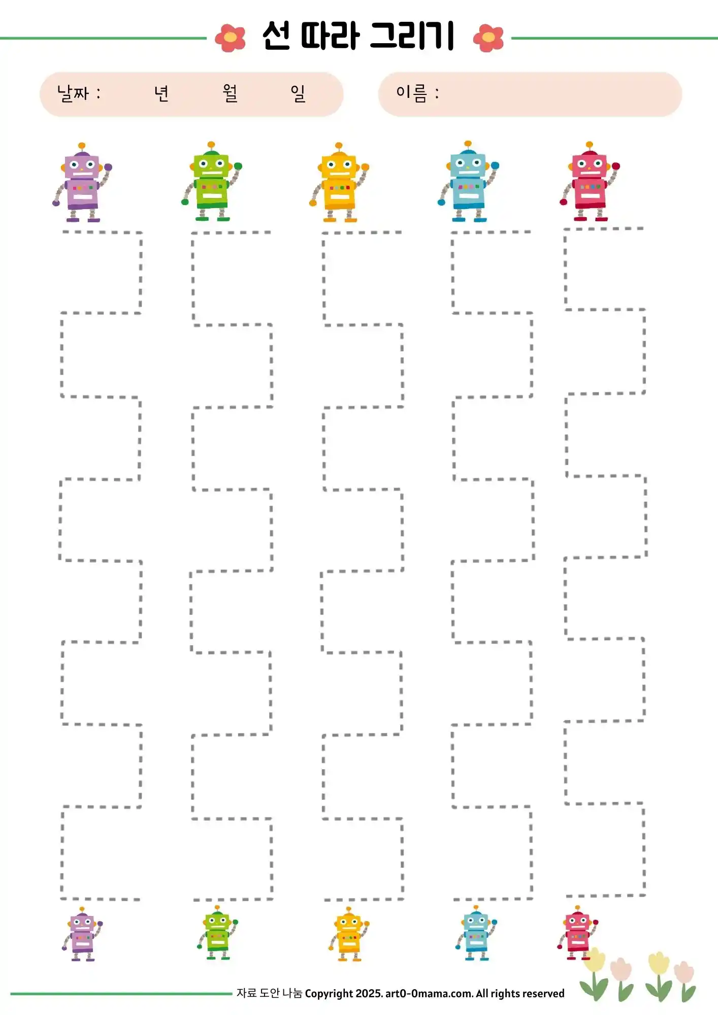 알록달록 귀여운 로봇 캐릭터와 함께 위에서 아래로 내려오는 길을 따라가며 선 긋기 연습을 할 수 있습니다. 아이들이 흥미를 잃지 않고 끝까지 집중할 수 있도록 디자인했습니다.